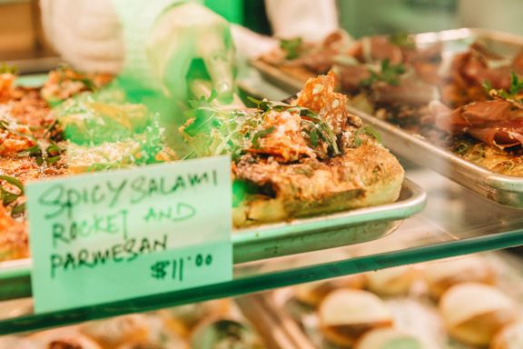 Get a slice of Italy on the go. Pizza joint Slice on Lombard Lane offers authentic street fare to take away. About seven different pizza flavours are available at any one time. Sample tasty creations like pork and fennel sausage with broccolini or salami and rocket. It will come as no surprise that the pizzas are sold by the slice. Owner Mia Tracey says they modelled the hole-in-the-wall joint on al taglio pizza bars in Rome, known for their rectangular-shaped slices. “It’s fresh, fast, no-fuss and made to be eaten standing up like the Romans do”. If you want to finish off with a sweet treat, the cabinet also has pistachio cannoli, tiramisu, and maritozzi — a sweet bun filled with creamy vanilla or chocolate.