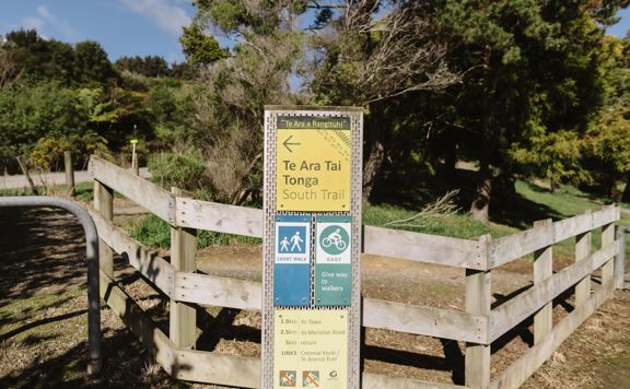 Te Ara Tai Tonga is a shared trail that can be completed in either direction. From the Spicer Botanical Park end, the trail follows a gentle gradient, ideal for biking and walking. It joins up to an old undulating vehicle track and continues past a water reservoir.